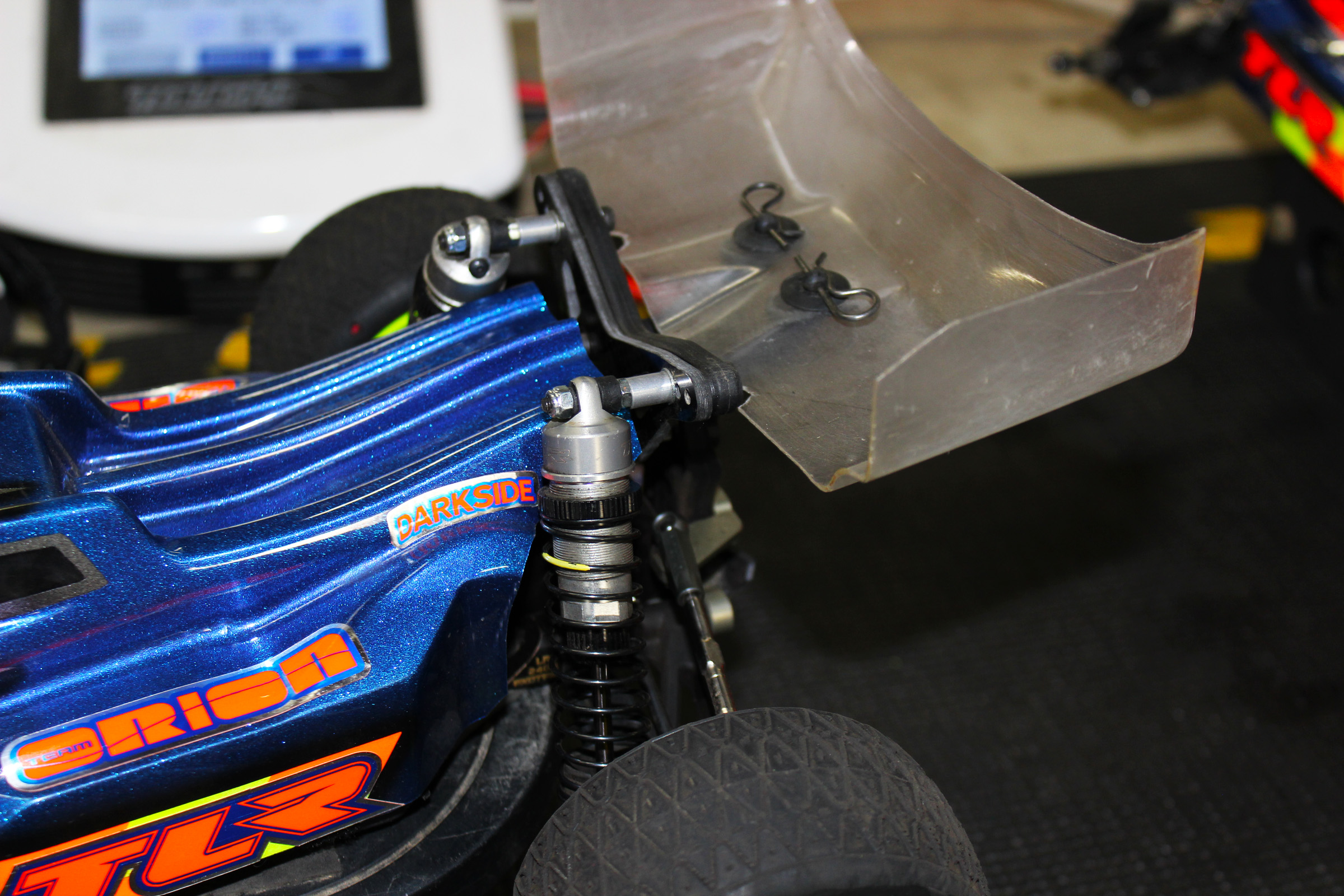 The X Factory Infinity tower brace moves the rear shocks to the front of the arms. In an interview, Dakotah said, “Moving the shocks forward helps smooth the car out through corner entry and exit, and helps it jump better.”